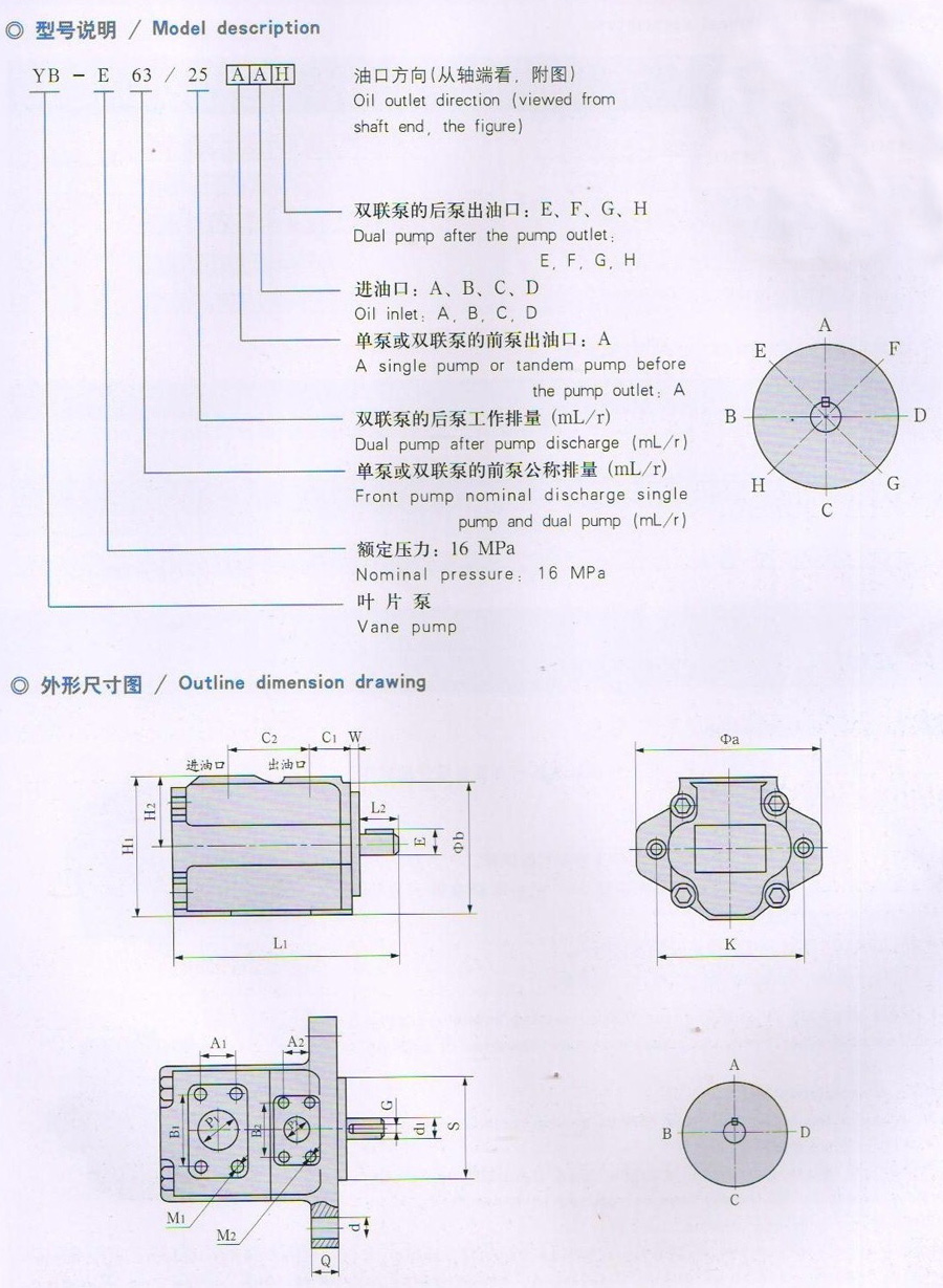 泵由轉子1、定子2、葉片3、配油盤和端蓋等部件所組成。定子的內表面是圓柱形孔。轉子和定子之間存在著偏心。葉片在轉子的槽內可靈活滑動,在轉子轉動時的離心力以及通入葉片根部壓力油的作用下,葉片頂部貼緊在定子內表面上,于是兩相鄰葉片、配油盤、定子和轉子間便形成了一個個密封的工作腔。當轉子按逆時針方向旋轉時,圖右側的葉片向外伸出,密封工作腔容積逐漸增大,產生真空,于是通過吸油口6和配油盤5上窗口將油吸入。而在圖的左側。葉片往里縮進,密封腔的容積逐漸縮小,密封腔中的油液經配油盤另一窗口和壓油口1被壓出而輸出到系統中去。這種泵在轉子轉一轉過程中,吸油壓油各一次,故稱單作用泵。轉子受到徑向液壓不平衡作用力,故又稱非平衡式泵,其軸承負載較大。改變定子和轉子間的偏心量,便可改變泵的排量,故這種泵都是變量泵。